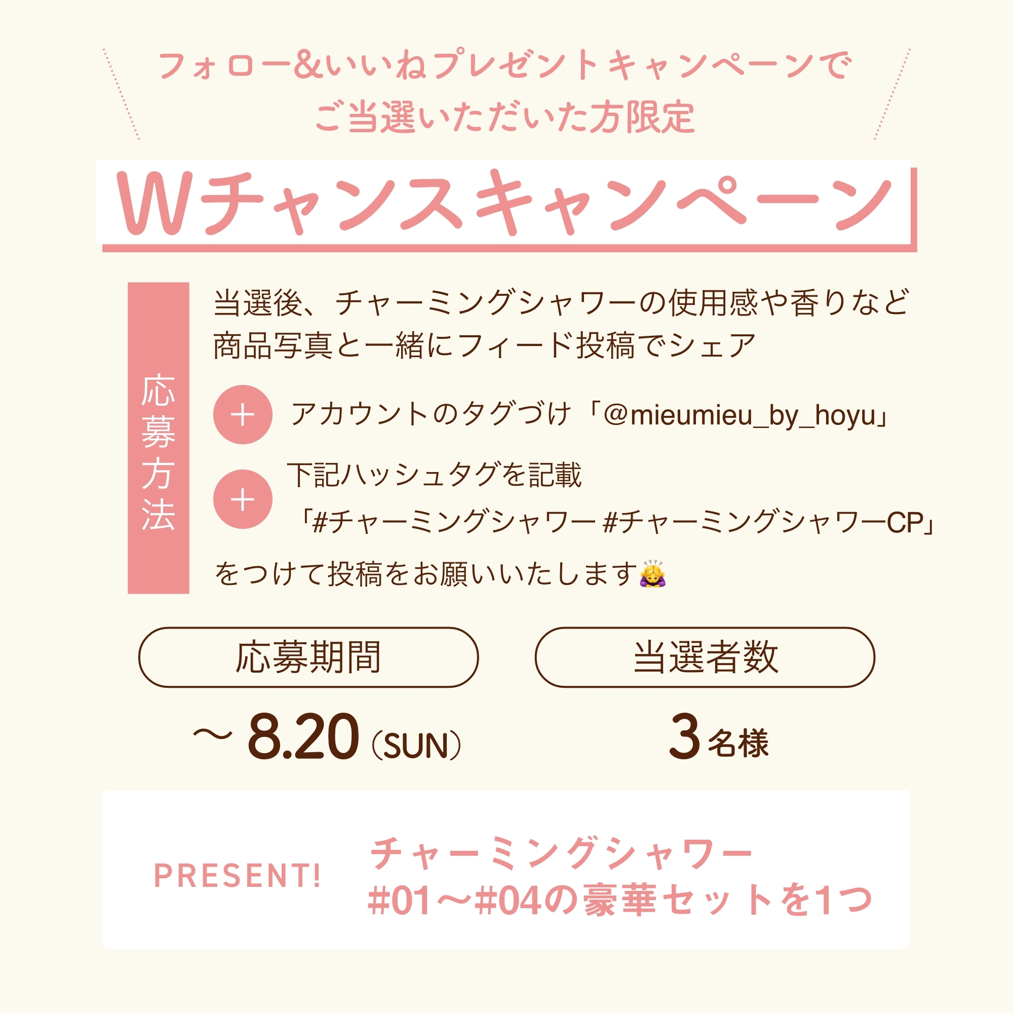 ホーユー株式会社(以下「当社」といいます)が企画・実施するキャンペーン「MieuMieuチャーミングシャワーW受賞記念キャンペーン」(以下「本キャンペーン」といいます)にご応募いただく前に、本応募規約をよくお読みください。なお、本キャンペーンにご応募いただいた方(以下「応募者」といいます)は、ご応募いただいた時点で、以下の内容にご同意いただいたものとみなします。本応募規約は本キャンペーンに関する応募者と当社の合意の内容となります。